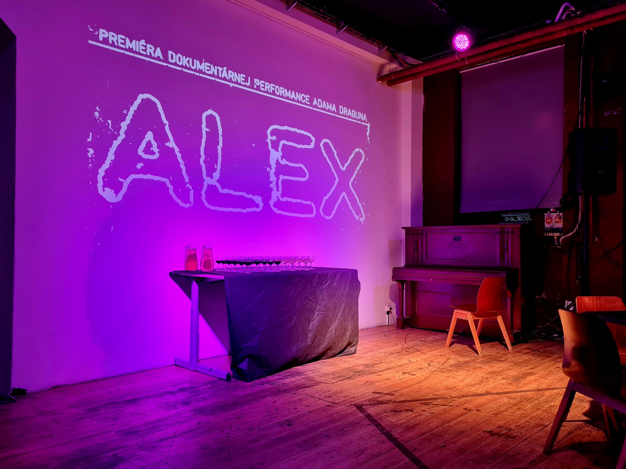 Stmieva sa, začínajú blikať reflektory a ozývajú sa silné basy. Sedím v prvej rade priestoru A4 v Bratislave, keď prichádza Adam Dragun a sadá si priamo vedľa mňa na schody. Work Life Balance - pieseň od nemeckej kapely Pisse strhla pozornosť celého obecenstva a perfektne zakotvuje vibe celého predstavenia. O kvalite soundtracku hry som však samozrejme ani chvíľu nepochybovala, nakoľko je Dragun sám hudobníkom pôsobiacim v kapele Berlin Manson. Súčasťou javiska, pokiaľ to tak teda môžeme nazvať, je mierne vyvýšená drevená plošina, plátno, ktoré visí zo stropu a stôl s dvoma stoličkami.