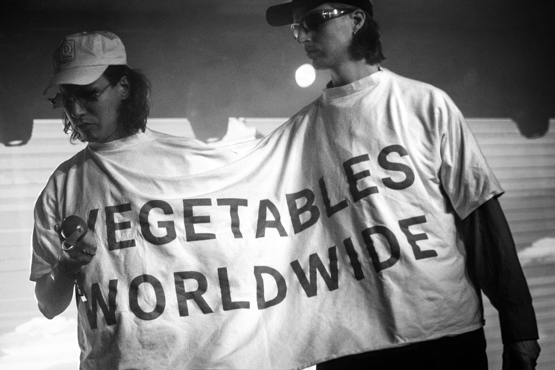 Jak se stmívá, přesuneme se opět dovnitř. Upřímně nevíme co čekat, když v programu vidíme Franek Warzywa & Młody Budda presents VEGETABLES WORLDWIDE. Brzy se seznámíme s polskou dvojicí v bílém dvojtričku, s tote bag plnou zeleniny. Tohle duo si teď říká vgtb.pl, a jak jejich starý, i nový název napovídá, jejich tématikou je zelenina.